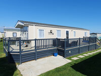 Caravan has extensive decking with lighing and is surrounded by well maintained grass.