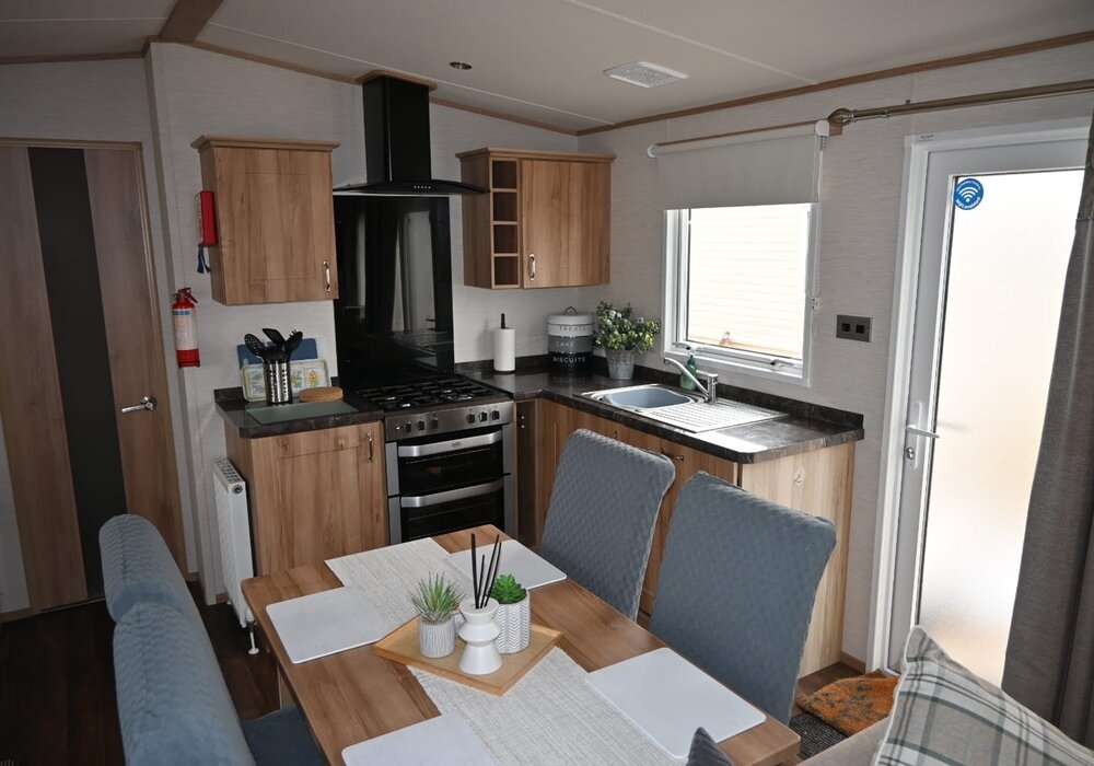 Open plan living area, comfy seating with a separate dining area. It has a good kitchen with everything needed for your stay.