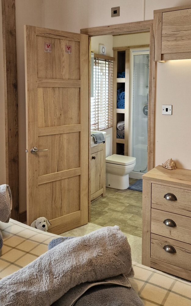 - Family Bathroom – Relax in a full-size bath with overhead shower, plus WC and basin – rare luxury for a holiday lodge.