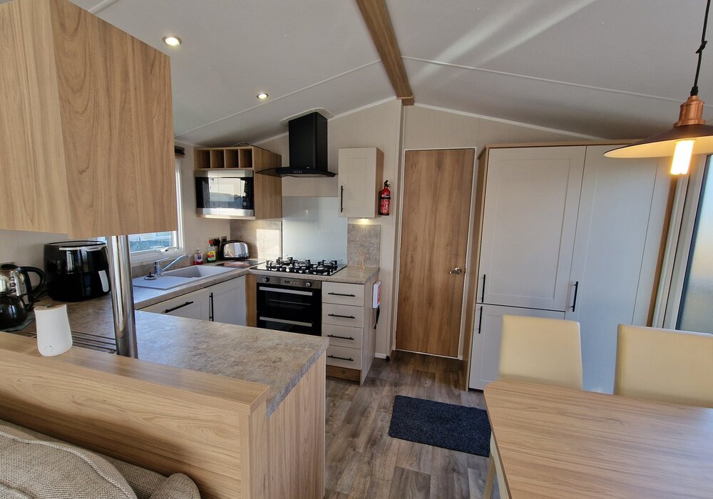 Large open plan living area, comfy seating with a separate dining area. It has a good size kitchen with everything needed for your stay.